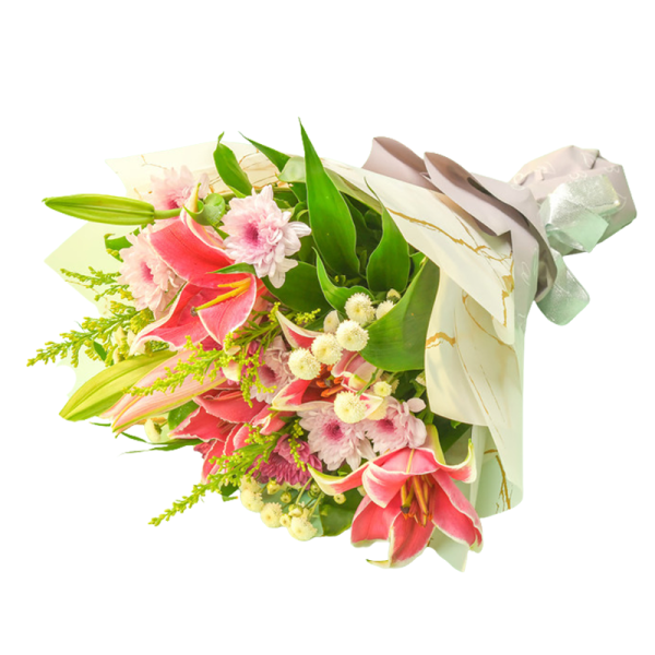A charming bunch of flowers, featuring delicate pink lilies that seem to whisper sweet secrets. Their soft, blushing petals create an aura of gentle elegance, evoking a sense of pure serenity. This bouquet is like a fragrant poetry, a testament to the quiet beauty found in simplicity, a lovely gift that warms the heart and brings a peaceful grace to any space.