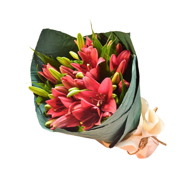 This beautiful flower bunch features lovely red lilies, a striking expression of nature’s elegance. Their vibrant petals create an enchanting display of grace and charm. A heartfelt gift that exudes simplicity and timeless beauty, perfect for adding warmth and sophistication to any celebration.​​​​​​​